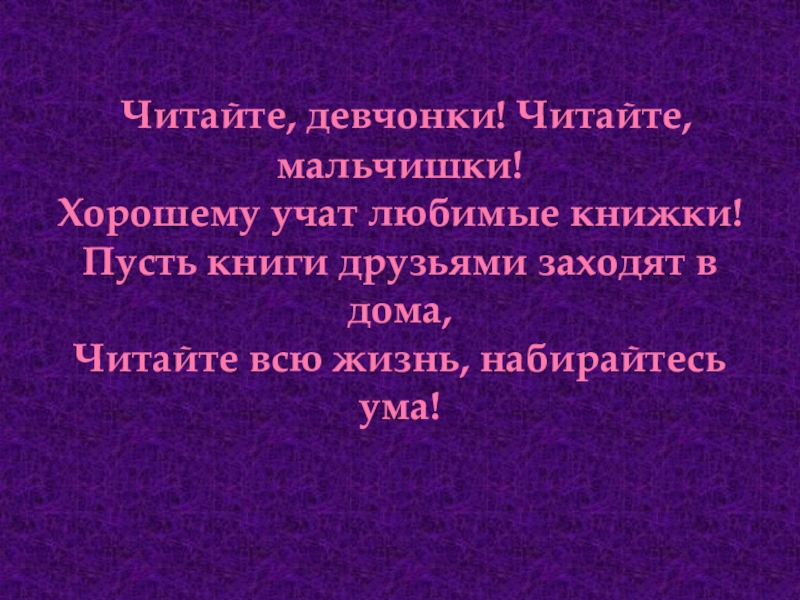 Читайте, девчонки! Читайте, мальчишки!  Хорошему учат любимые книжки!  Пусть книги друзьями заходят в дома, Читайте всю