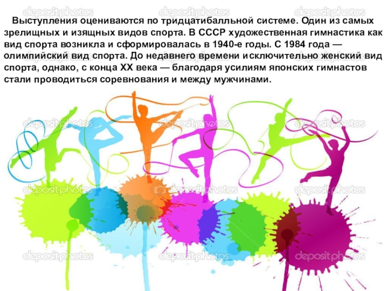 Выступления оцениваются по тридцатибалльной системе. Один из самых зрелищных и изящных видов спорта. В СССР художественная гимнастика как
