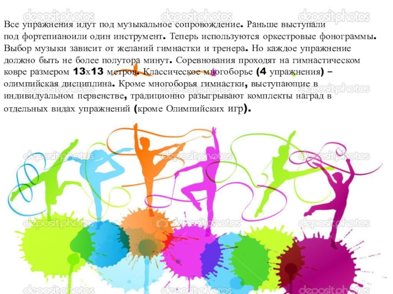 Слайд 4Все упражнения идут под музыкальное сопровождение. Раньше выступали под фортепианоили один инструмент.