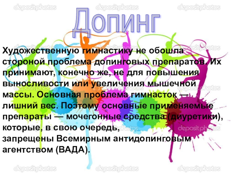 Допинг Художественную гимнастику не обошла стороной проблема допинговых препаратов. Их принимают, конечно же, не для повышения выносливости или увеличения