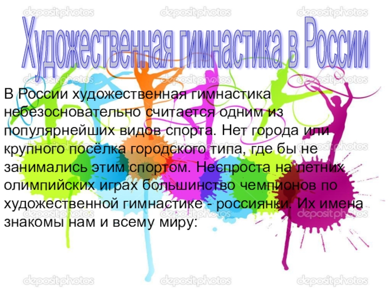 Художественная гимнастика в России В России художественная гимнастика небезосновательно считается одним из популярнейших видов спорта. Нет города