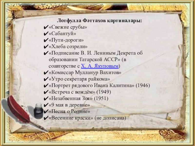 Лотфулла Фәттахов – «В.И. Ленин Татарстан АССРны төзү турындагы декретка кул куя» (Харис Якупов белән бергә), «Ватан турында җыр», «Игеннәр өлгерде», «Яңа бура», «Яшьлек», «Сабантуй», «Мулланур Вахитов», «Шәһәрдән кайту» һ.б. бик күп картиналар авторы.