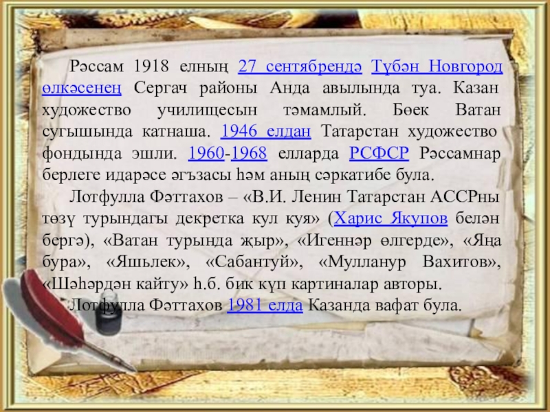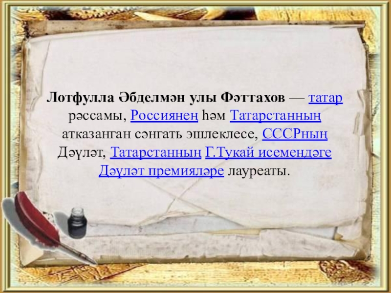 Слайд 2Лотфулла Әбделмән улы Фәттахов — татар рәссамы, Россиянең һәм Татарстанның атказанган