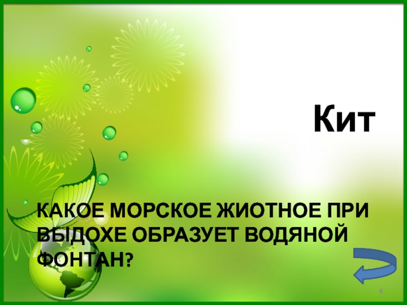 Слайд 6КАКОЕ МОРСКОЕ ЖИОТНОЕ ПРИ ВЫДОХЕ ОБРАЗУЕТ ВОДЯНОЙ ФОНТАН?