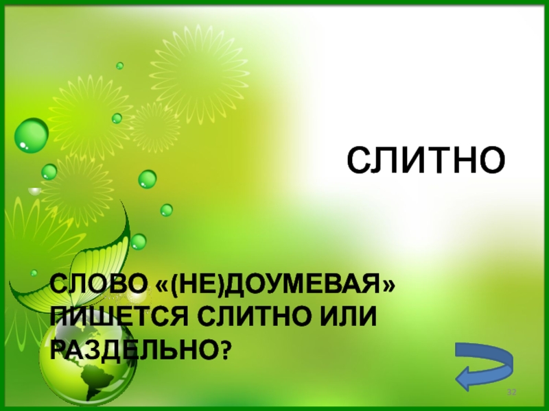 Слайд 32Слово «(не)доумевая» пишется слитно или раздельно?