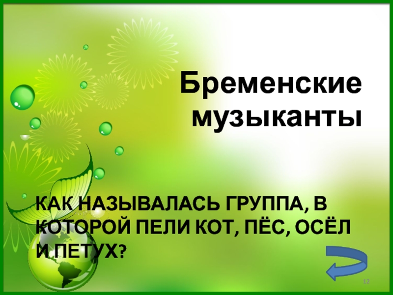Слайд 12Как называлась группа, в которой пели кот, пёс, осёл и петух?