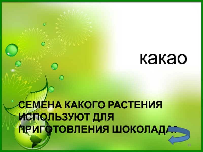 Слайд 33Семена какого растения используют для приготовления шоколада?