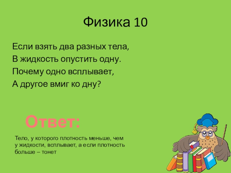 Тело, у которого плотность меньше, чем у жидкости, всплывает, а если плотность больше – тонет