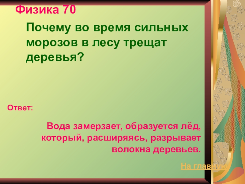 Вода замерзает, образуется лёд, который, расширяясь, разрывает волокна деревьев.