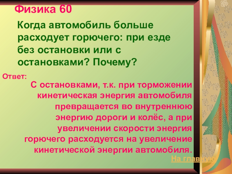 С остановками, т.к. при торможении кинетическая энергия автомобиля превращается во внутреннюю энергию дороги и колёс, а при увеличении скорости энергия горючего расходуется на увеличение кинетической энергии автомобиля.