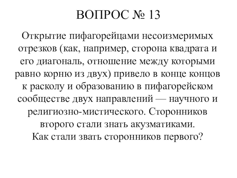его диагональ, отношение между которыми равно корню из двух) привело в конце концов к расколу и образованию в пифагорейском сообществе двух направлений — научного и религиозно-мистического. Сторонников второго стали знать акузматиками.