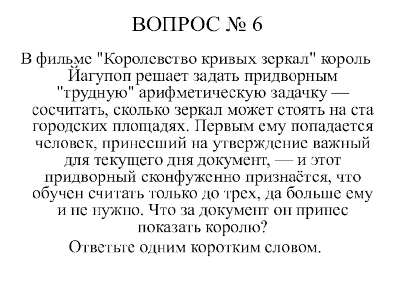 придворным "трудную" арифметическую задачку — сосчитать, сколько зеркал может стоять на ста городских площадях. Первым ему попадается человек, принесший на утверждение важный для текущего дня документ, — и этот придворный сконфуженно признаётся, что обучен считать только до трех, да больше ему и не нужно. Что за документ он принес показать королю?