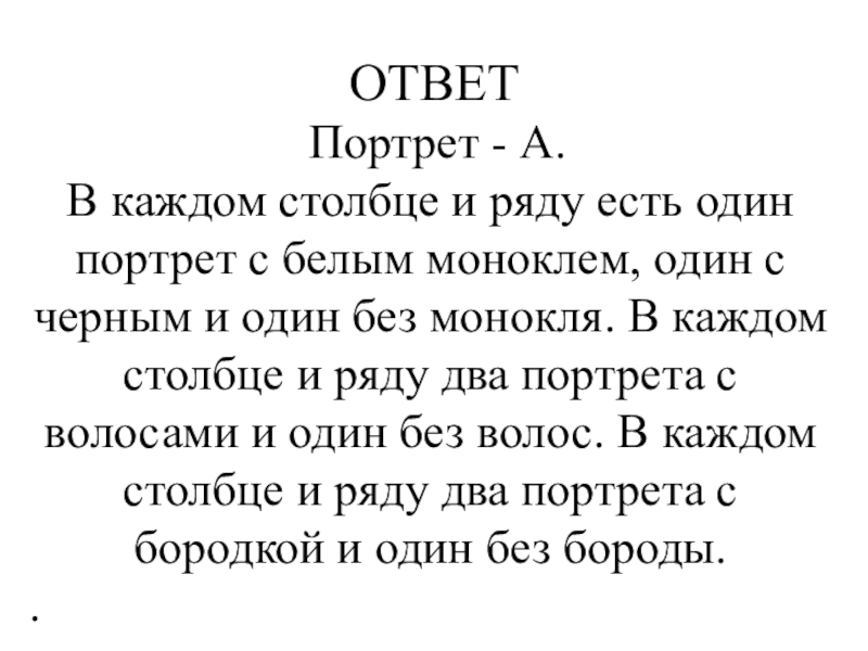 с белым моноклем, один с черным и один без монокля. В каждом столбце и ряду два портрета с волосами и один без волос. В каждом столбце и ряду два портрета с бородкой и один без бороды.