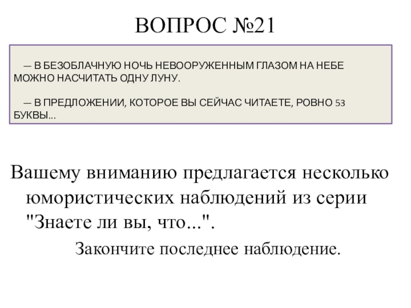 — В БЕЗОБЛАЧНУЮ НОЧЬ НЕВООРУЖЕННЫМ ГЛАЗОМ НА НЕБЕ МОЖНО НАСЧИТАТЬ ОДНУ ЛУНУ.