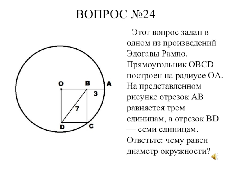 OBCD построен на радиусе OA. На представленном рисунке отрезок AB равняется трем единицам, а отрезок BD — семи единицам. Ответьте: чему равен диаметр окружности?