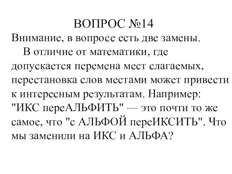 допускается перемена мест слагаемых, перестановка слов местами может привести к интересным результатам. Например: "ИКС переАЛЬФИТЬ" — это почти то же самое, что "с АЛЬФОЙ переИКСИТЬ". Что мы заменили на ИКС и АЛЬФА?