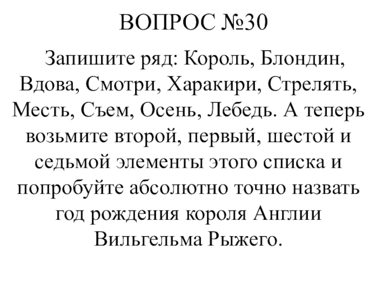 Осень, Лебедь. А теперь возьмите второй, первый, шестой и седьмой элементы этого списка и попробуйте абсолютно точно назвать год рождения короля Англии Вильгельма Рыжего.