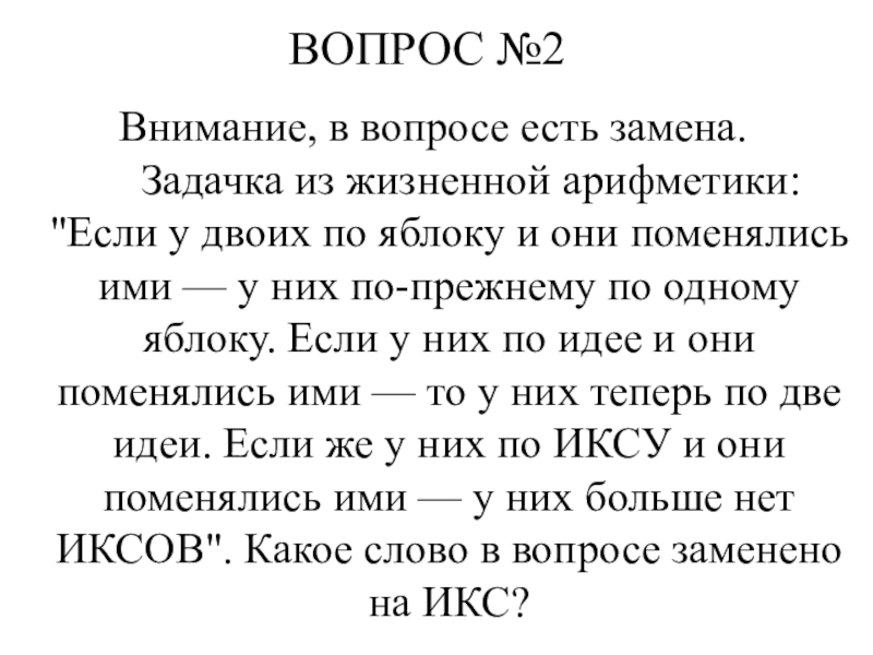 по яблоку и они поменялись ими — у них по-прежнему по одному яблоку. Если у них по идее и они поменялись ими — то у них теперь по две идеи. Если же у них по ИКСУ и они поменялись ими — у них больше нет ИКСОВ". Какое слово в вопросе заменено на ИКС?