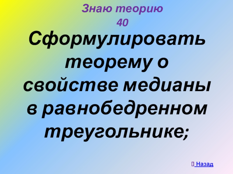Знаю теорию 40Сформулировать теорему о свойстве медианы в равнобедренном треугольнике; Назад