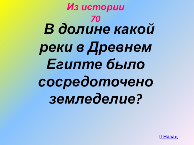 НазадИз истории 70 В долине какой реки в Древнем Египте было сосредоточено земледелие?