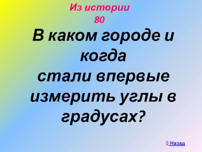 НазадИз истории 80В каком городе и когдастали впервые измерить углы в градусах?