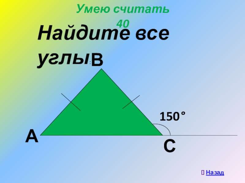 НазадУмею считать 40Найдите все углы:АСВ150°