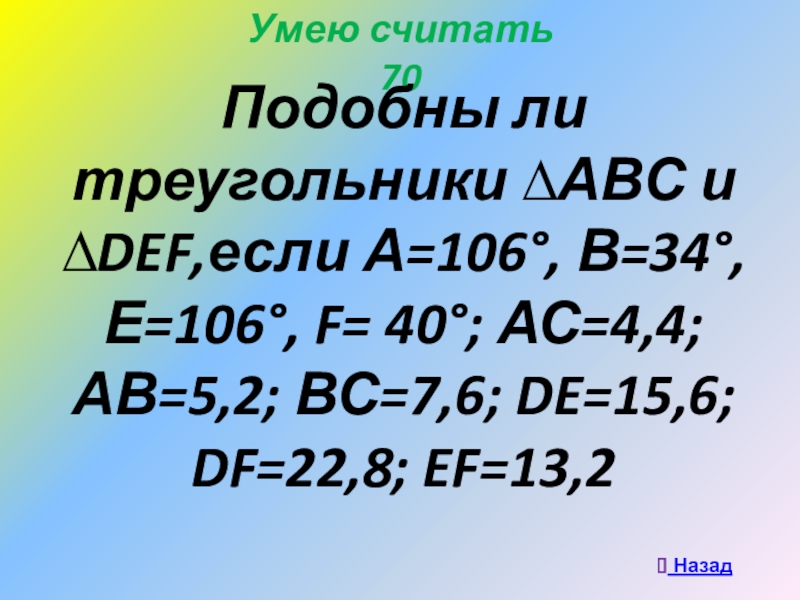 НазадУмею считать 70Подобны ли треугольники ∆АВС и ∆DEF,если А=106°, В=34°, Е=106°, F= 40°; АС=4,4; АВ=5,2; ВС=7,6;