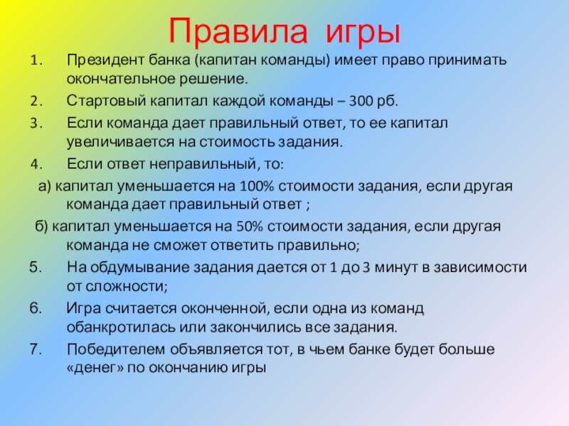 Правила игрыПрезидент банка (капитан команды) имеет право принимать окончательное решение.Стартовый капитал каждой команды – 300 рб.Если команда дает правильный ответ, то ее капитал увеличивается на стоимость задания.Если ответ неправильный, то: а) капитал уменьшается на 100% стоимости