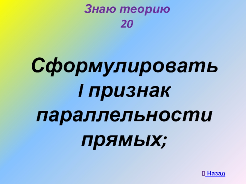 Знаю теорию 20Сформулировать I признак параллельности прямых; Назад