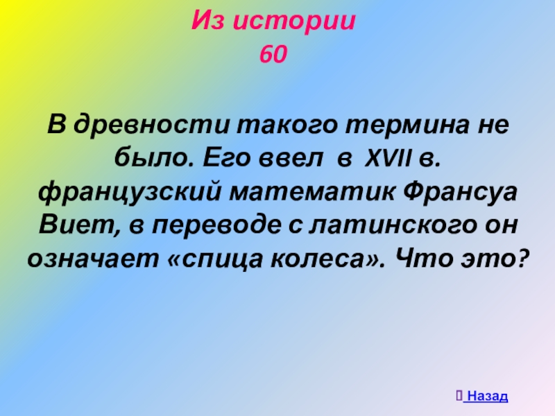 НазадИз истории 60В древности такого термина не было. Его ввел в XVII в. французский математик Франсуа