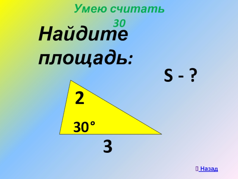 НазадУмею считать 30Найдите площадь:S - ?3230°