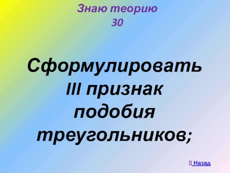 Знаю теорию 30Сформулировать III признак подобия треугольников; Назад