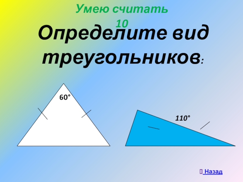НазадУмею считать 10Определите вид треугольников:110°60°