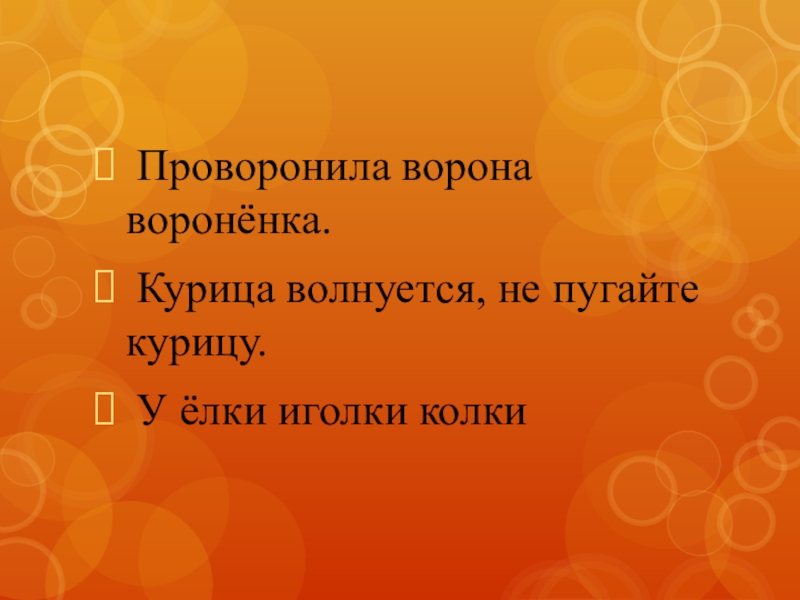 Проворонила ворона воронёнка. Курица волнуется, не пугайте курицу. У ёлки иголки колки
