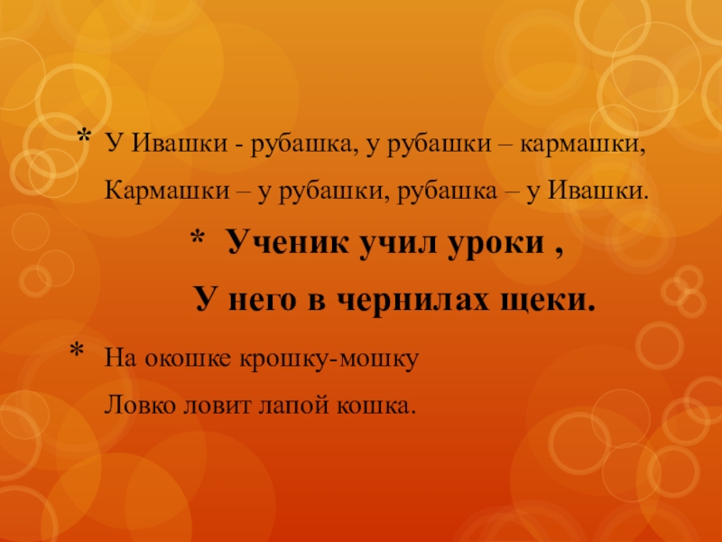 * У Ивашки - рубашка, у рубашки – кармашки, Кармашки – у рубашки, рубашка – у Ивашки. * Ученик учил уроки , У него в чернилах щеки. * На окошке крошку-мошку Ловко ловит лапой кошка.