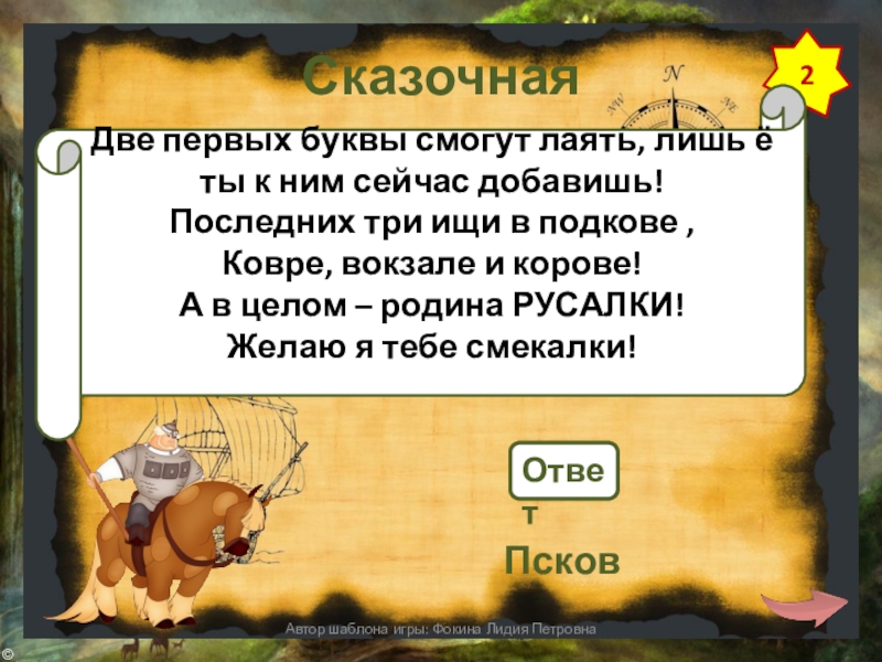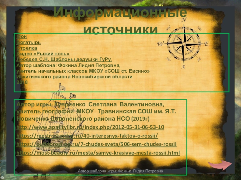 Автор игры: Куприенко Светлана Валентиновна, учитель географии МКОУ Травнинская СОШ им. Я.Т. Новиченко Доволенского района НСО (2019г)