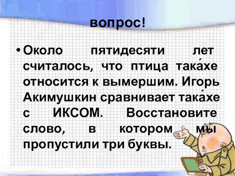 Акимушкин сравнивает така́хе с ИКСОМ. Восстановите слово, в котором мы пропустили три буквы.