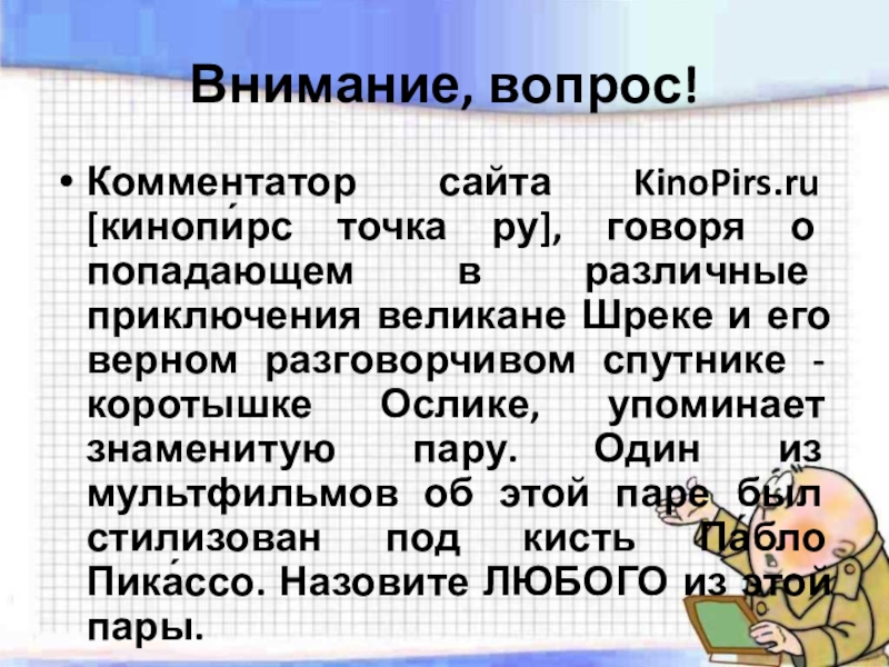 различные приключения великане Шреке и его верном разговорчивом спутнике - коротышке Ослике, упоминает знаменитую пару. Один из мультфильмов об этой паре был стилизован под кисть Па́бло Пика́ссо. Назовите ЛЮБОГО из этой пары.