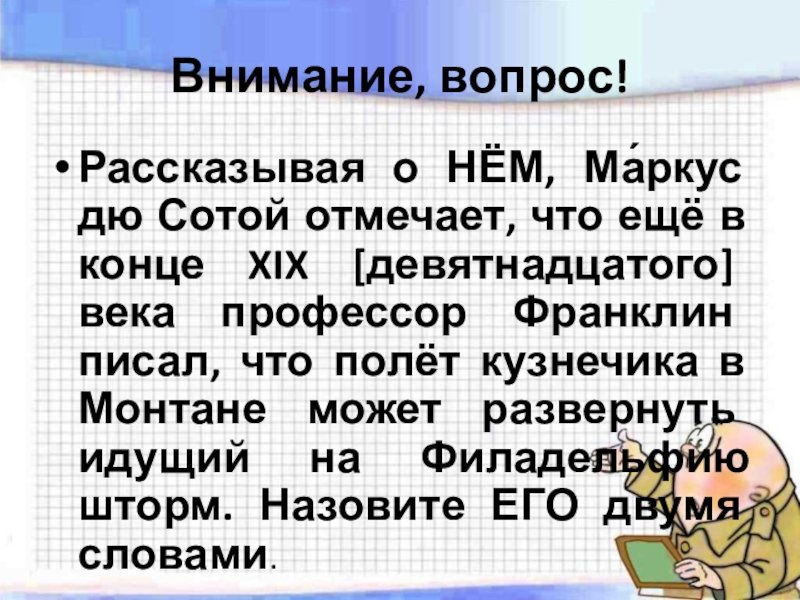 конце XIX [девятнадцатого] века профессор Франклин писал, что полёт кузнечика в Монтане может развернуть идущий на Филадельфию шторм. Назовите ЕГО двумя словами.