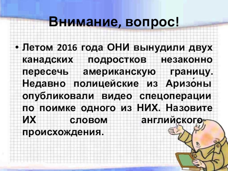 американскую границу. Недавно полицейские из Аризо́ны опубликовали видео спецоперации по поимке одного из НИХ. Назовите ИХ словом английского происхождения.