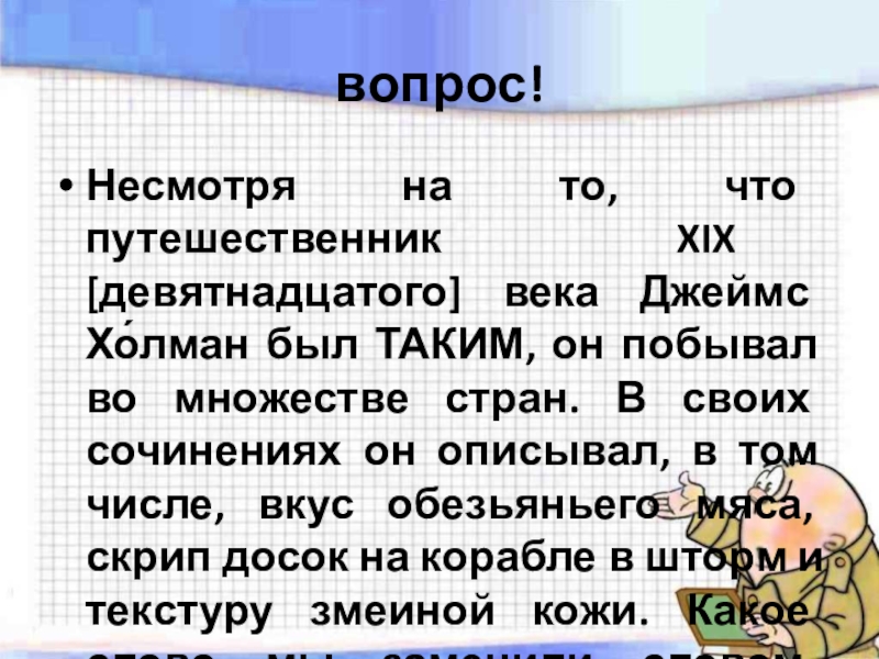 ТАКИМ, он побывал во множестве стран. В своих сочинениях он описывал, в том числе, вкус обезьяньего мяса, скрип досок на корабле в шторм и текстуру змеиной кожи. Какое слово мы заменили словом ТАКОЙ?