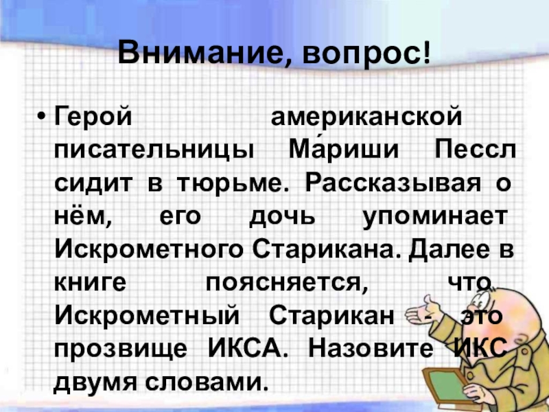 нём, его дочь упоминает Искрометного Старикана. Далее в книге поясняется, что Искрометный Старикан - это прозвище ИКСА. Назовите ИКС двумя словами.