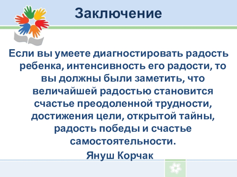 Заключение Если вы умеете диагностировать радость ребенка, интенсивность его радости, то вы должны были заметить, что величайшей