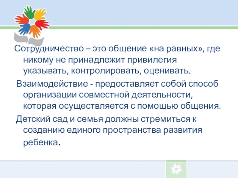 Сотрудничество – это общение «на равных», где никому не принадлежит привилегия указывать, контролировать, оценивать. Взаимодействие - предоставляет