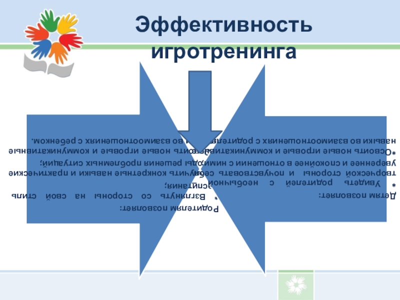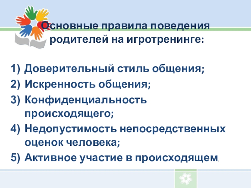 Основные правила поведения родителей на игротренинге:Доверительный стиль общения;Искренность общения;Конфиденциальность происходящего;Недопустимость непосредственных оценок человека;Активное участие в происходящем.