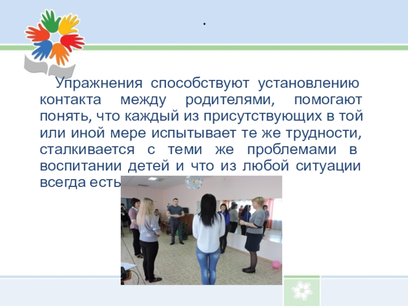.  Упражнения способствуют установлению контакта между родителями, помогают понять, что каждый из присутствующих в той или