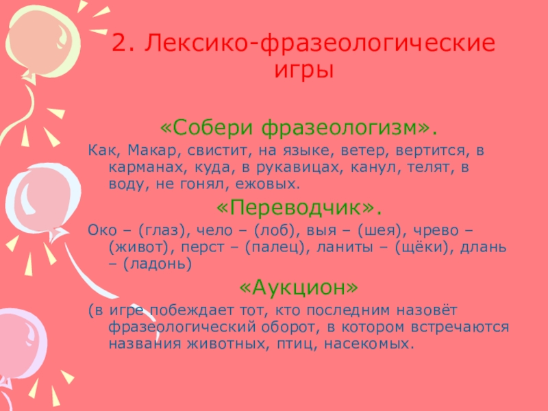 Слайд 242. Лексико-фразеологические игры