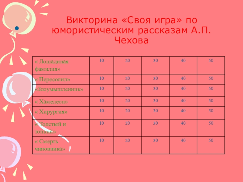 Слайд 13Викторина «Своя игра» по юмористическим рассказам А.П.Чехова