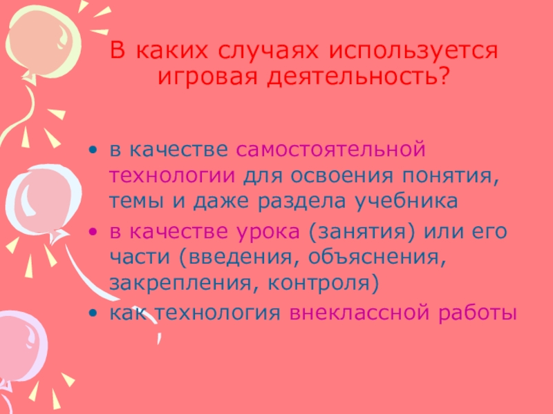 Слайд 4В каких случаях используется игровая деятельность?