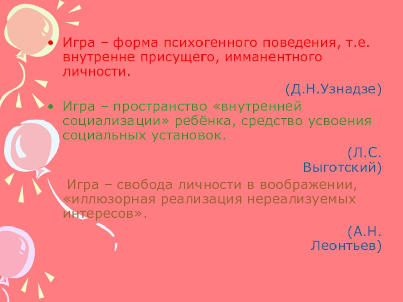 Игра – форма психогенного поведения, т.е. внутренне присущего, имманентного личности.